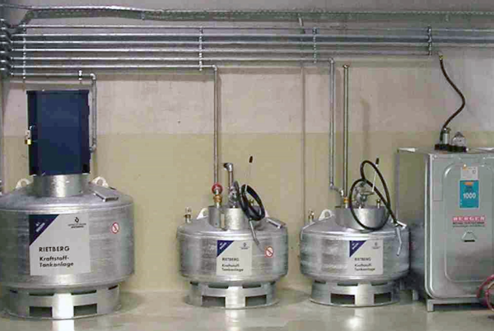 The cylindrical and cubic storage containers (standing or lying) are equipped with ventilation, withdrawal, and filling pipes. They are pressure-resistant against explosion shocks and suitable for flammable liquids of hazard classes AI, AIII, and B according to DIN 6623.