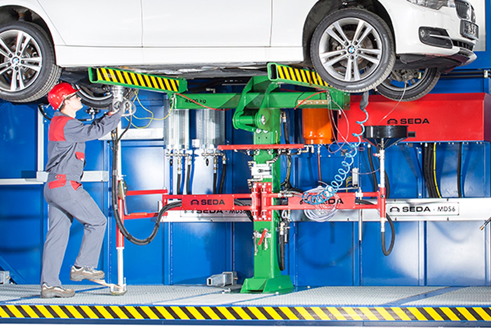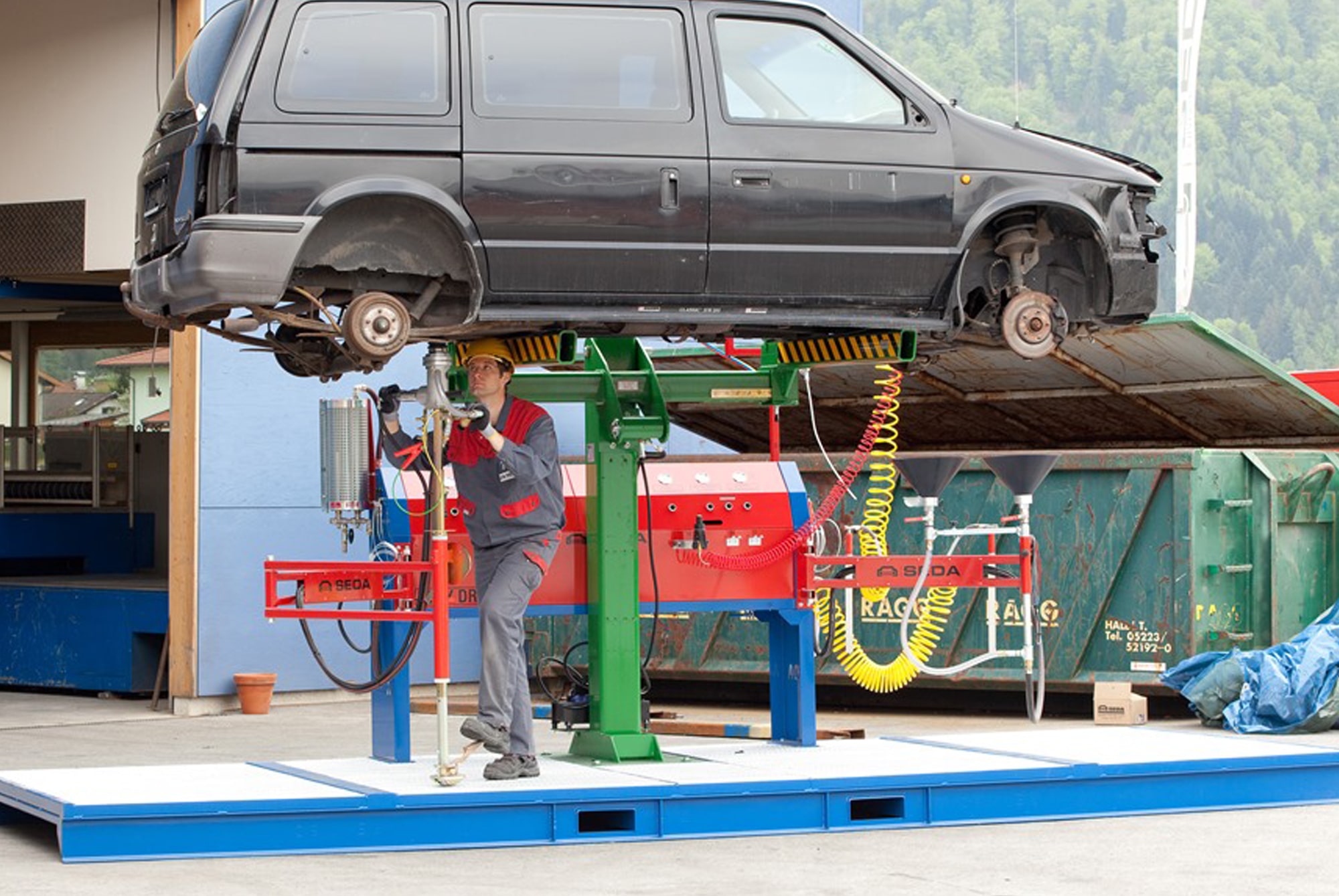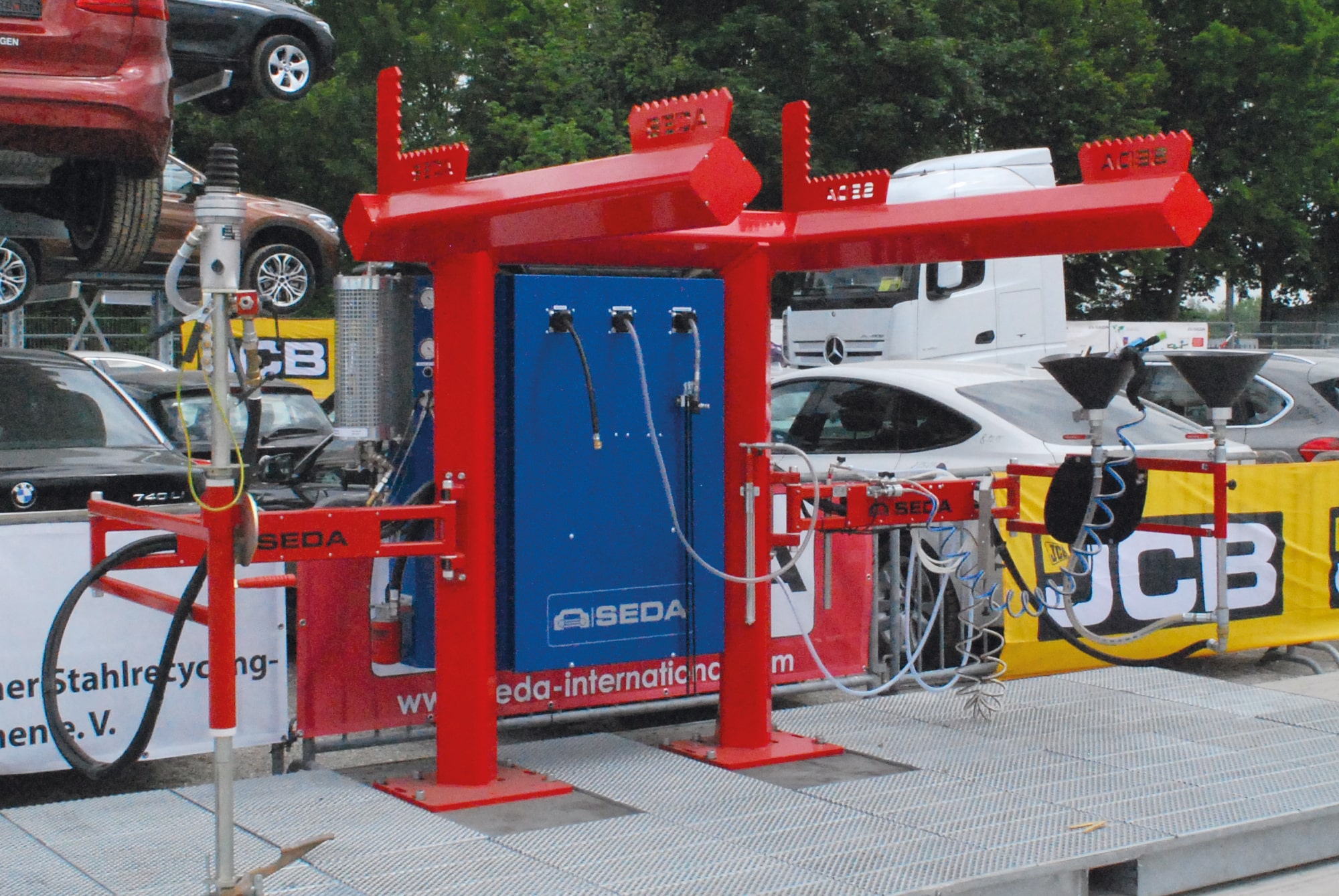 The SEDA FT1 vehicle racks are robust steel constructions designed to ensure optimal support for vehicles. They are available in various versions: a hydraulically tiltable unit and a rigid version with or without two optional vertical supports.