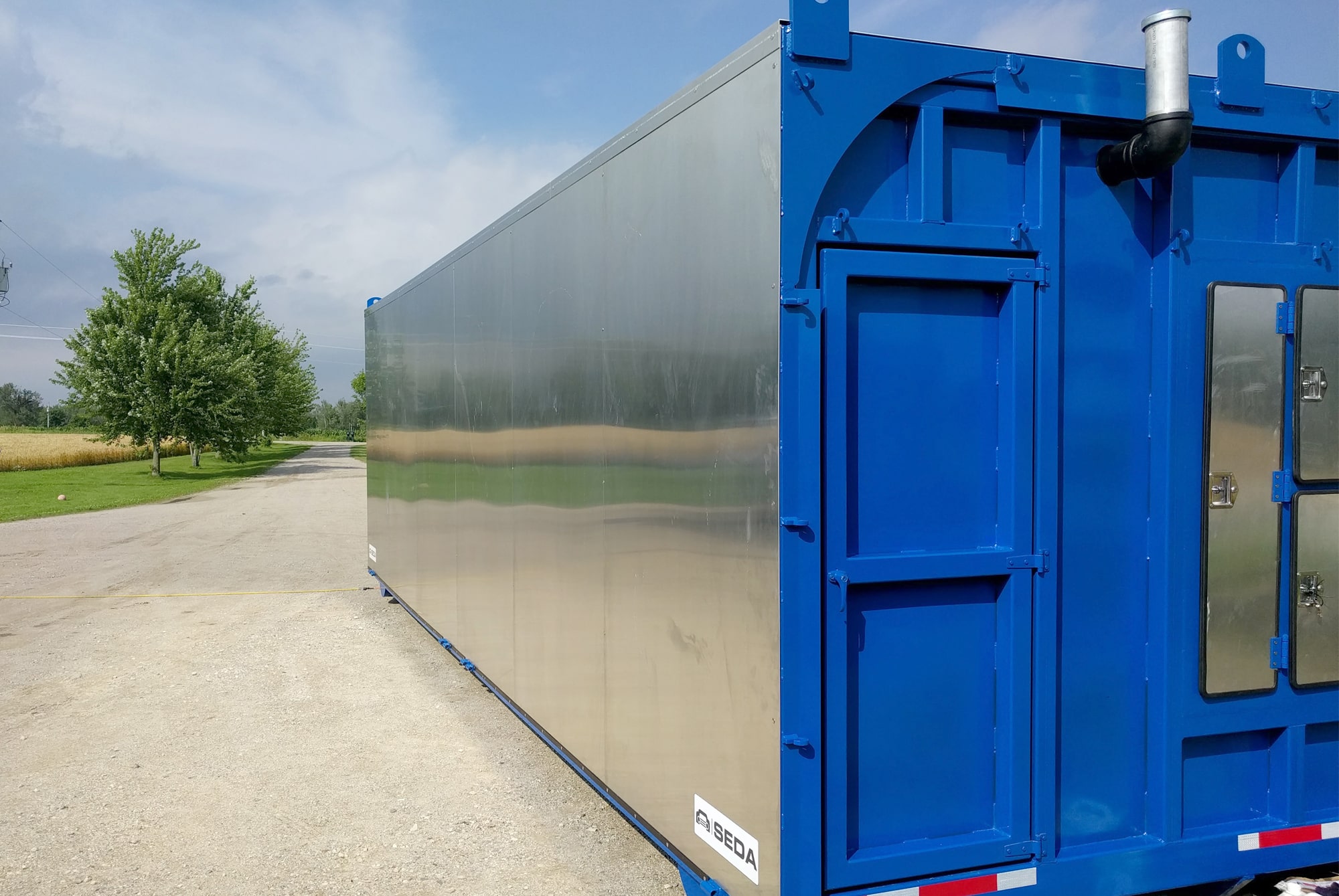 Als Abrollcontainer konzipiert, ist er mit einer vollständig integrierten Trockenlegungsanlage ausgestattet. Die Containerabdeckung lässt sich aufklappen und fungiert als Dach, wodurch ein effektiver Regenschutz gewährleistet wird.