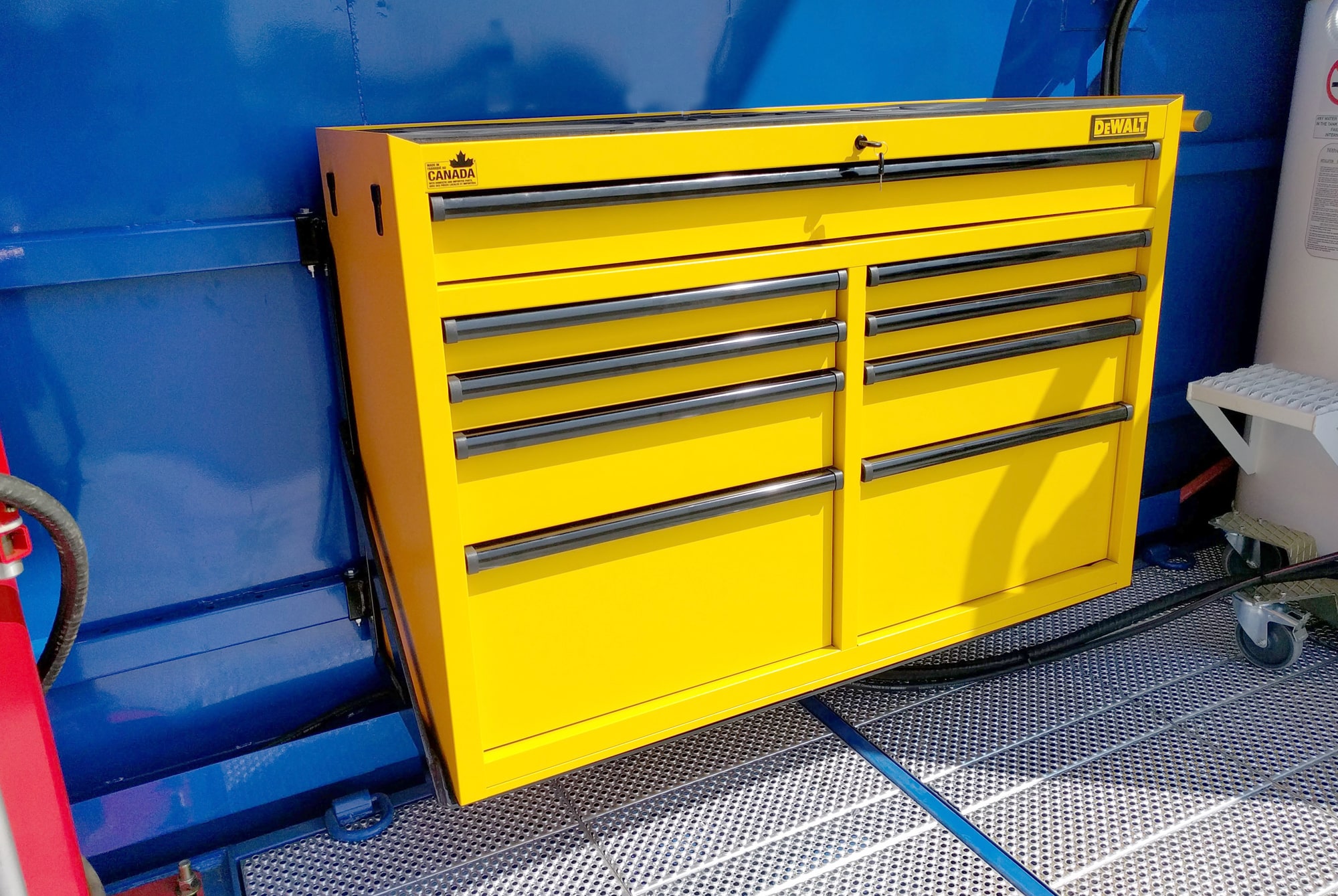 Im Inneren des Containers sind ein Fahrzeugträger mit einer Tragkraft von4 Tonnen sowie Bodenwannen gemäß WHG §19l fest installiert. Ergänzend dazu bietet der Container wichtige Arbeitshilfen wie eine Werkbank und einen Werkzeugkasten.