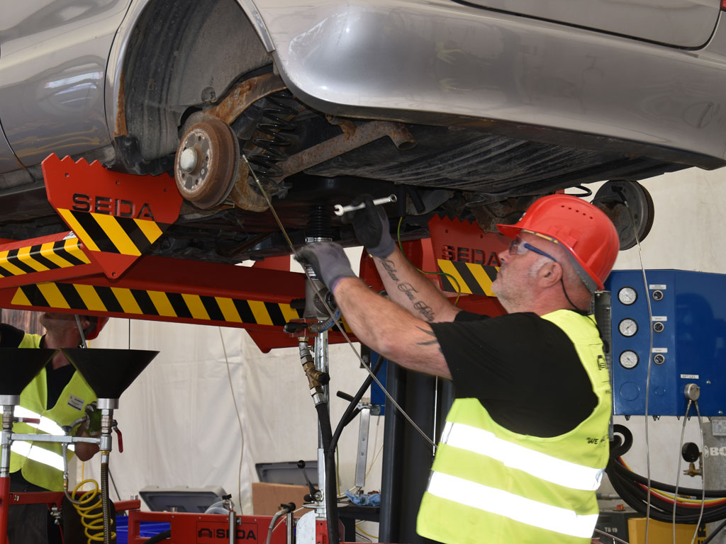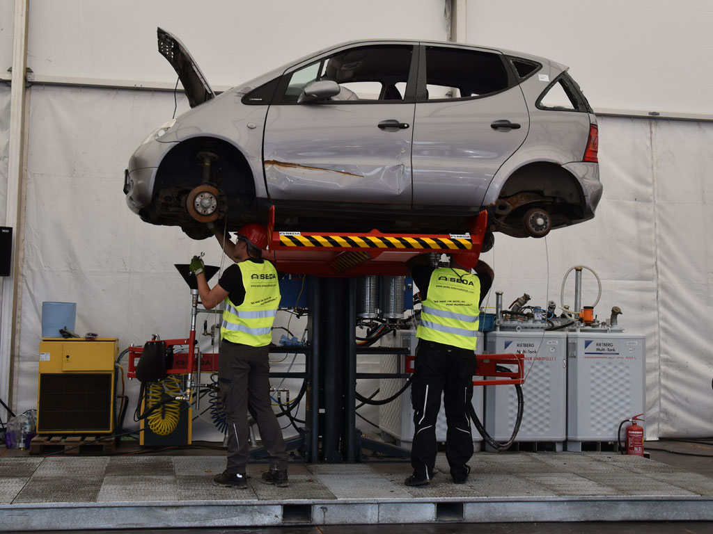 At this stage the vehicle is prepared for depollution. On average, there are 22 liters of liquid in an end-of-life vehicle. Now it is the turn of the new DrainLift Professional system, which is explosion-proof in accordance with ATEX. It consists of a hydraulic single-column platform with all the necessary tools for draining. Such a professional system enables a vehicle to be completely depolluted in just a few minutes. The tank is drilled with a special Fuel Tank Drilling Device, which immediately sucks the fuel out of the tanks. Upon visual inspection, the fuel is flown into the corresponding tank on a mobile tank platform. After that, special hoses are connected to the brake nipples and the brake fluid is depolluted with the help of one of the extra vacuum pumps. Two suction lances are used to pierce the container with the windscreen cleaning fluid and the coolant and they suck up these liquids. It means that all the processes run simultaneously and enable quick, safe and environmentally-friendly depollution of an end-of-life vehicle