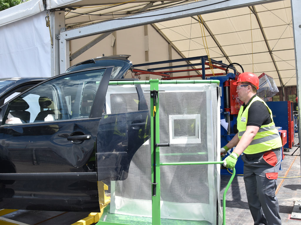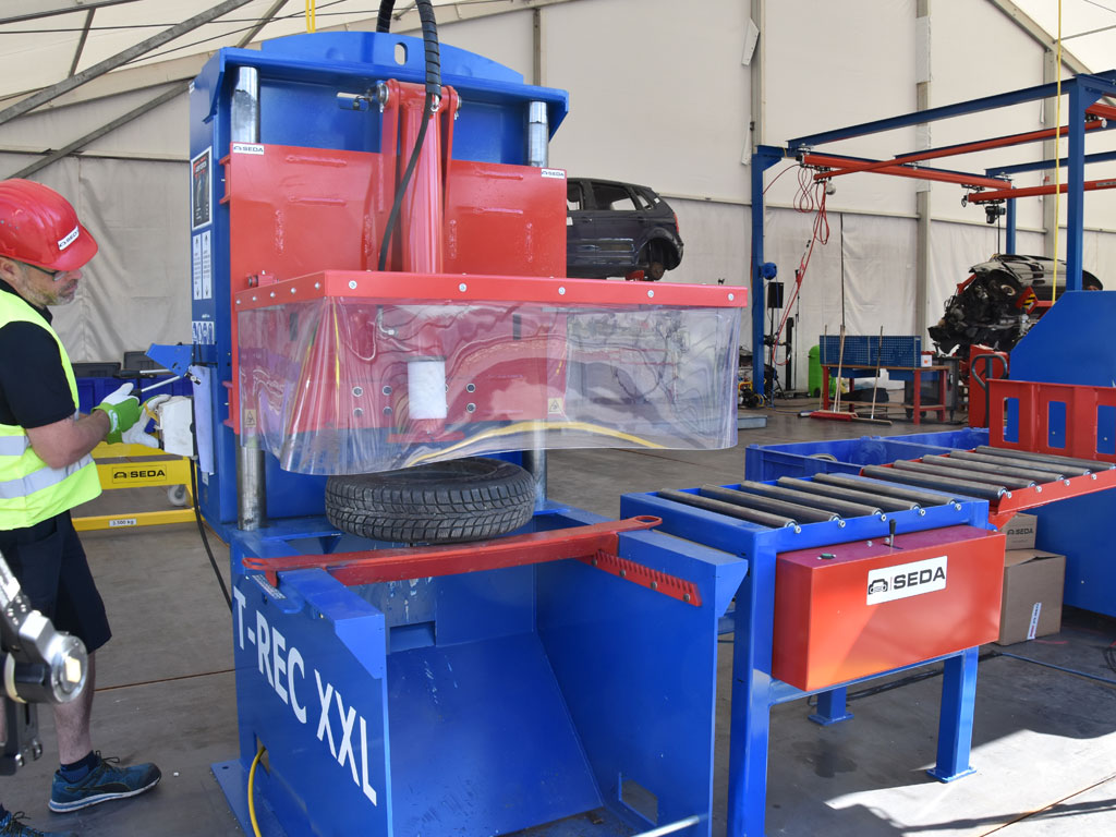 Once a vehicle has been selected for recycling, its preparation starts according to the data in the EDP-system. We work out a disassembly and dismantling plan for the parts that can be prepared for further sale and use. All the other parts get into the raw material recycling process. There are two ways a car part may be handled – either resale or raw material recycling. Dismantling is launched on a so-called vehicle trolley. This mobile trolley provides an easy positioning of an ELV in the workshop without a forklift. The model of a forklift-free workshop has been very popular in the recycling industry, since the maintenance costs are low and possible dangers of forklift operating are eliminated. Heavy metals and potential sources of inflammation are removed from the vehicle. At first, it is urgent to dismantle the battery and, if necessary, suck the LPG/CNG gas out. The explosive car parts that should by no means end up in the shredder, such as the pyrotechnic gas generators of the airbags, are removed or neutralized in the vehicle. Once an airbag is removed, it is stored in a special transportation box for dangerous goods. If the seats and items of the car interior are not going to be sold, a quick and easy way to neutralize the airbags is immediately inside the vehicle. For that a SEDA Multiplex device, which is connected to the airbag control unit, is used. Light detonations are caused by the belt tensioners. Strong detonations are to be expected from the front and side airbags. Removed airbag systems are dangerous, therefore special restrictions and certain responsibilities in terms of storage and transportation rest with a car recycler. With the help of SEDA airbag cabin (ANC) we can neutralize airbags safely and soundly. After the procedure has been accomplished, there are no special requirements for storage, transportation or disposal any more. Then the windows are smashed and we get all the shards into a special glass trolley. We have now stripped the carcass of the first batch of raw materials and now it is ready for an agile dismantling. Further preparatory work steps include depolluting the liquids from the upper engine compartment, sucking the climate gas with the AC Remover (ACR) and taking off the wheels. The T-REC XXL press enables a quick separation of tires and wheel rims (suitable for 13–22-inch rims).
