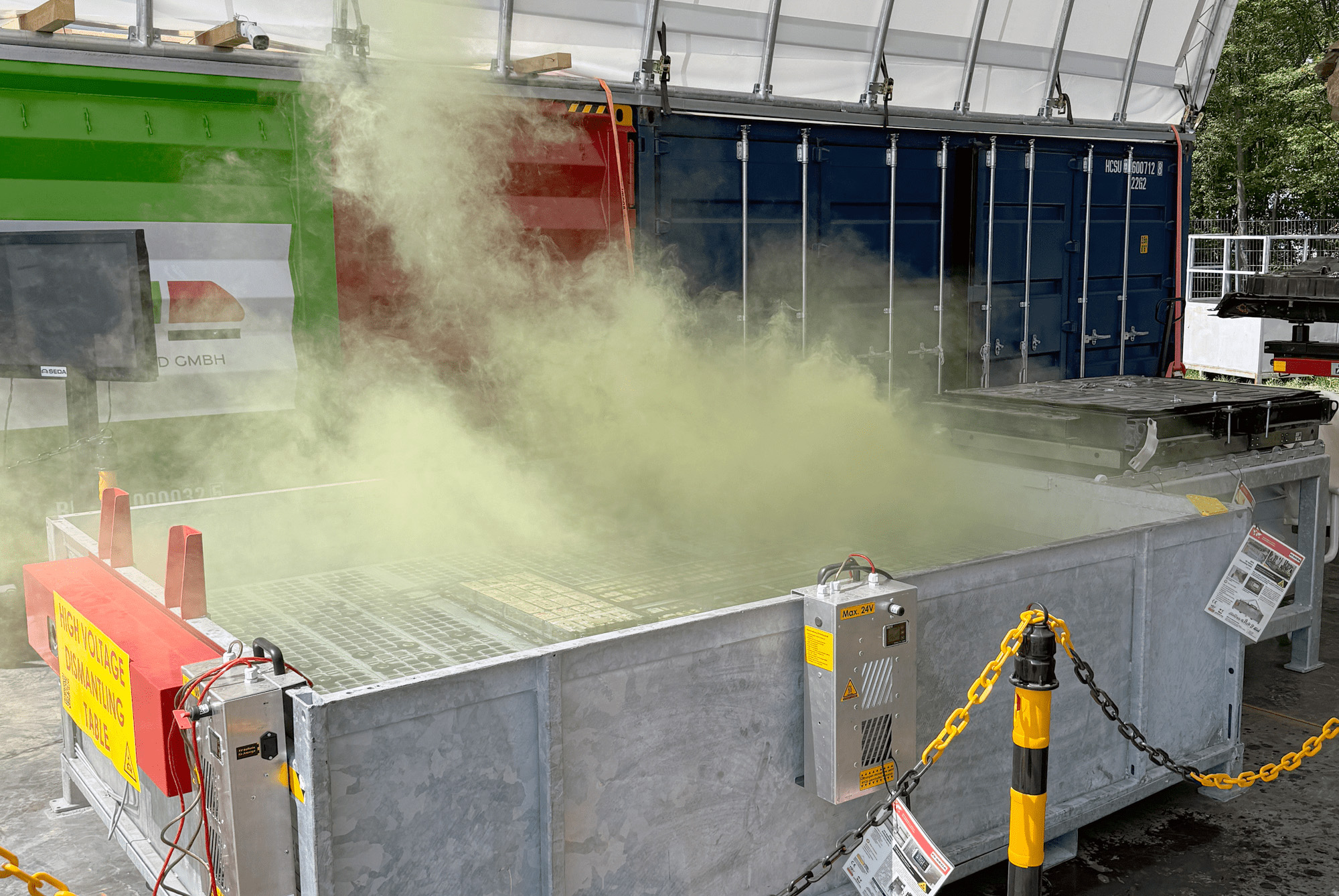 In the event of a malfunction during the disassembly process, the HV storage unit can be safely lowered into the water basin. The basin can then be removed from the building using a forklift. If the energy storage unit needs to remain on the disassembly table, for example, overnight, an automatic lowering mechanism is triggered if the temperature exceeds 68°C. This is activated by thermal fuses or a camera system, ensuring the energy storage unit is safely submerged in the basin.