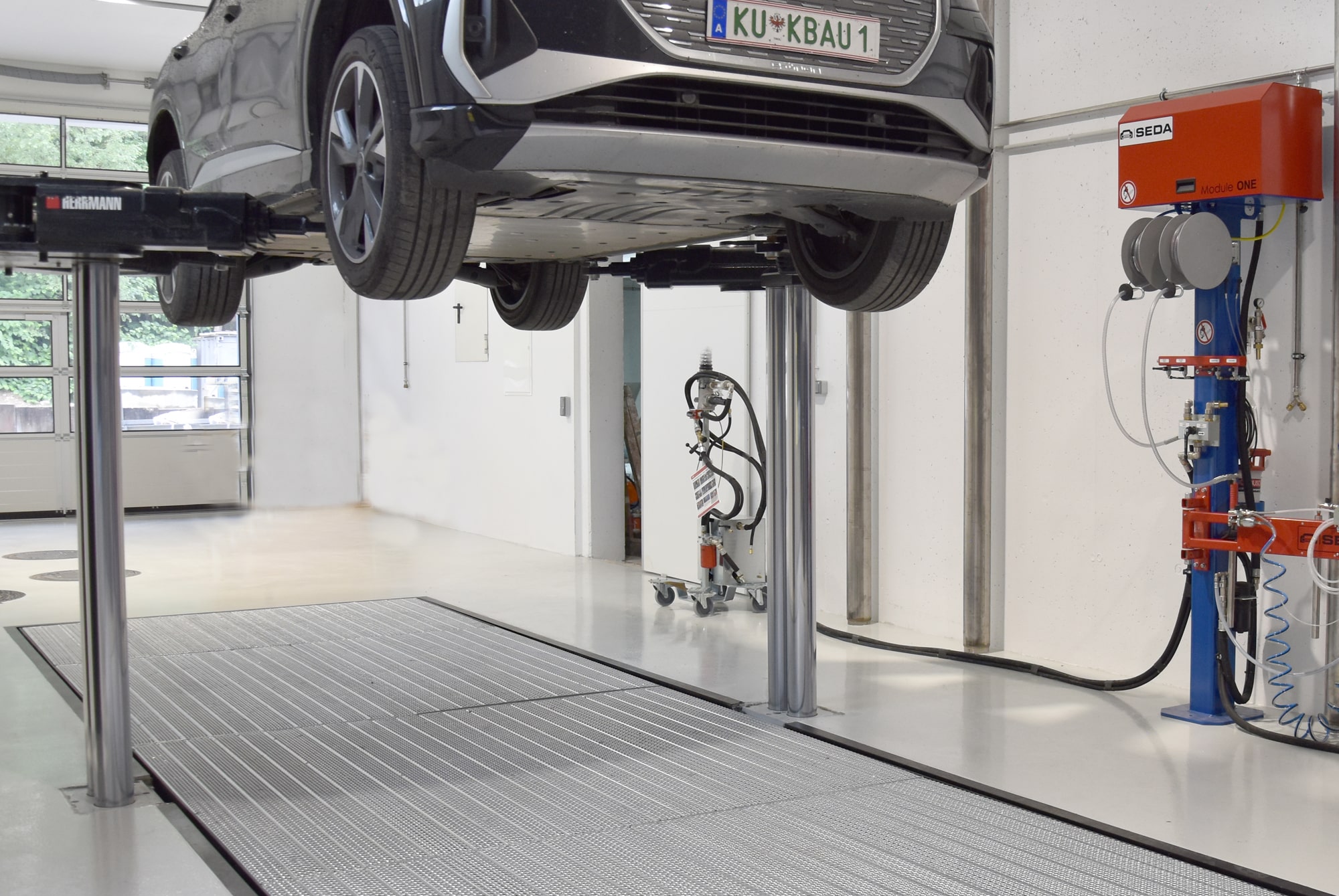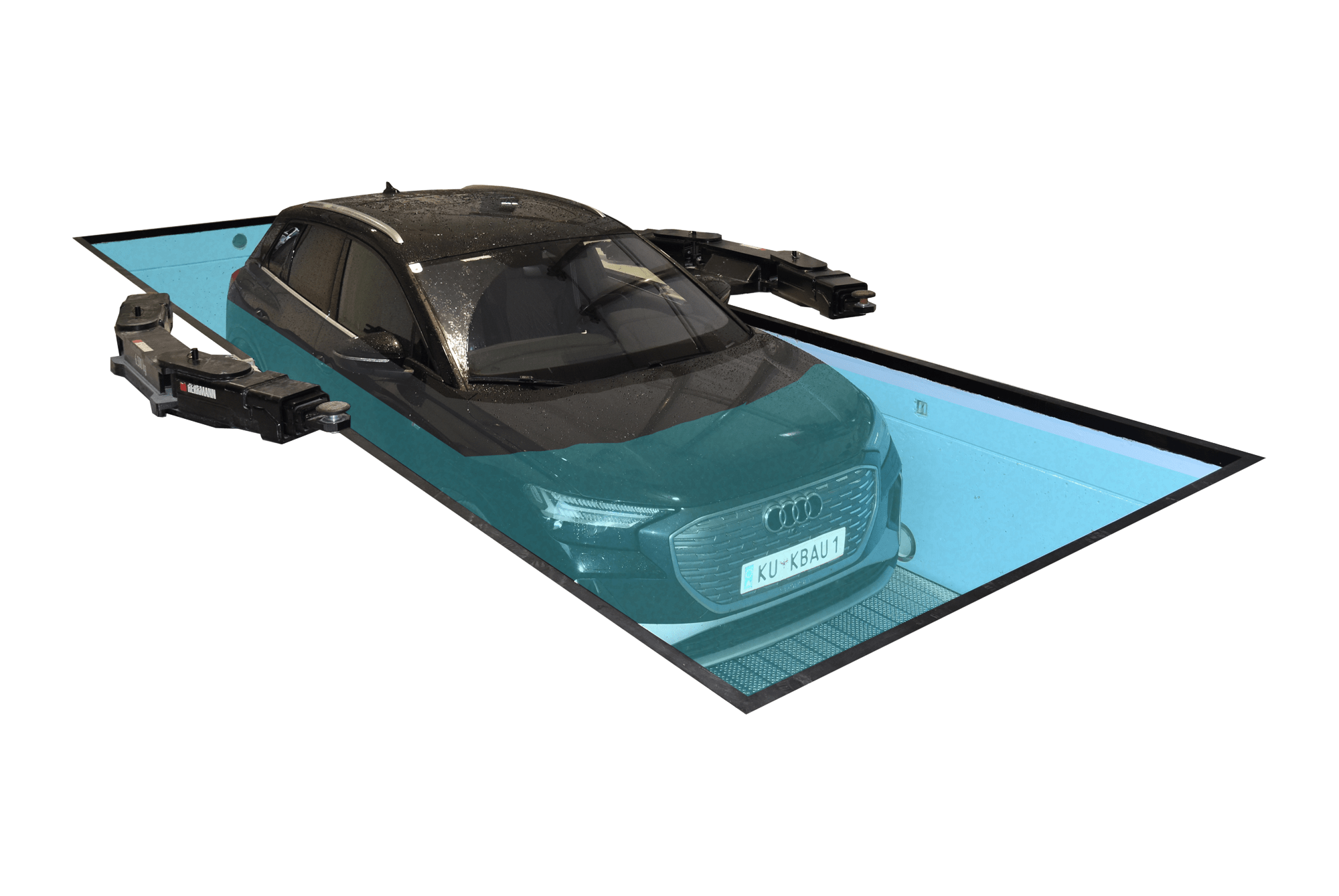 The 2-post lift is specifically designed for tasks involving vehicles with high-voltage batteries. Additionally, it allows the vehicle to be submerged in a coolant bath (water or an alternative coolant) if necessary.