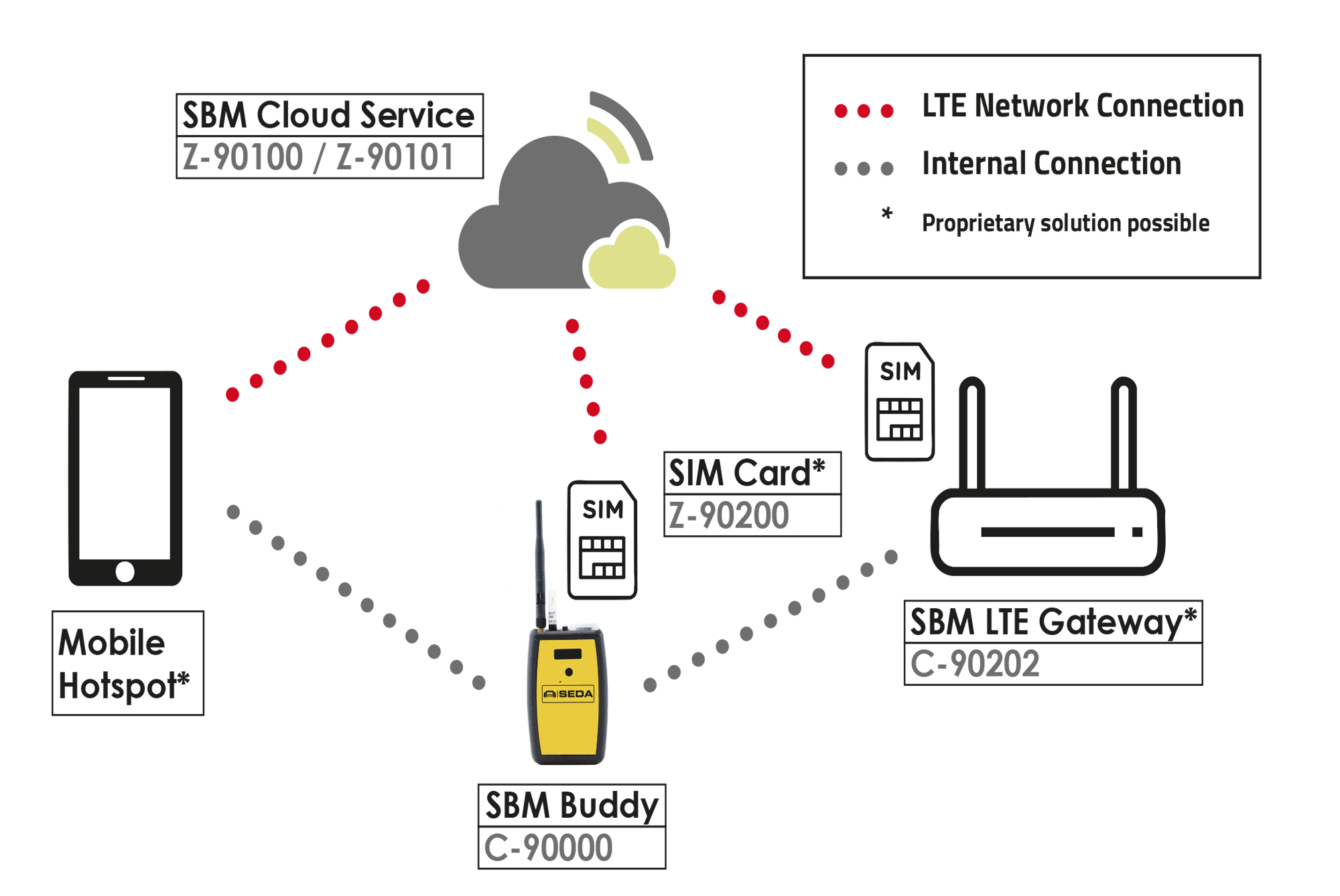 SBM Buddy is a compact monitoring device that continuously measures key parameters such as temperature and gases (e.g., carbon monoxide and hydrogen). It features wireless data transmission, a long battery life of up to one year (depending on the monitoring mode), and can issue visual and acoustic alarms. In areas without cellular reception—such as basements or metal enclosures—a second device acts as a repeater. For mobile use, the Buddy is equipped with GPS and LTE functionality.