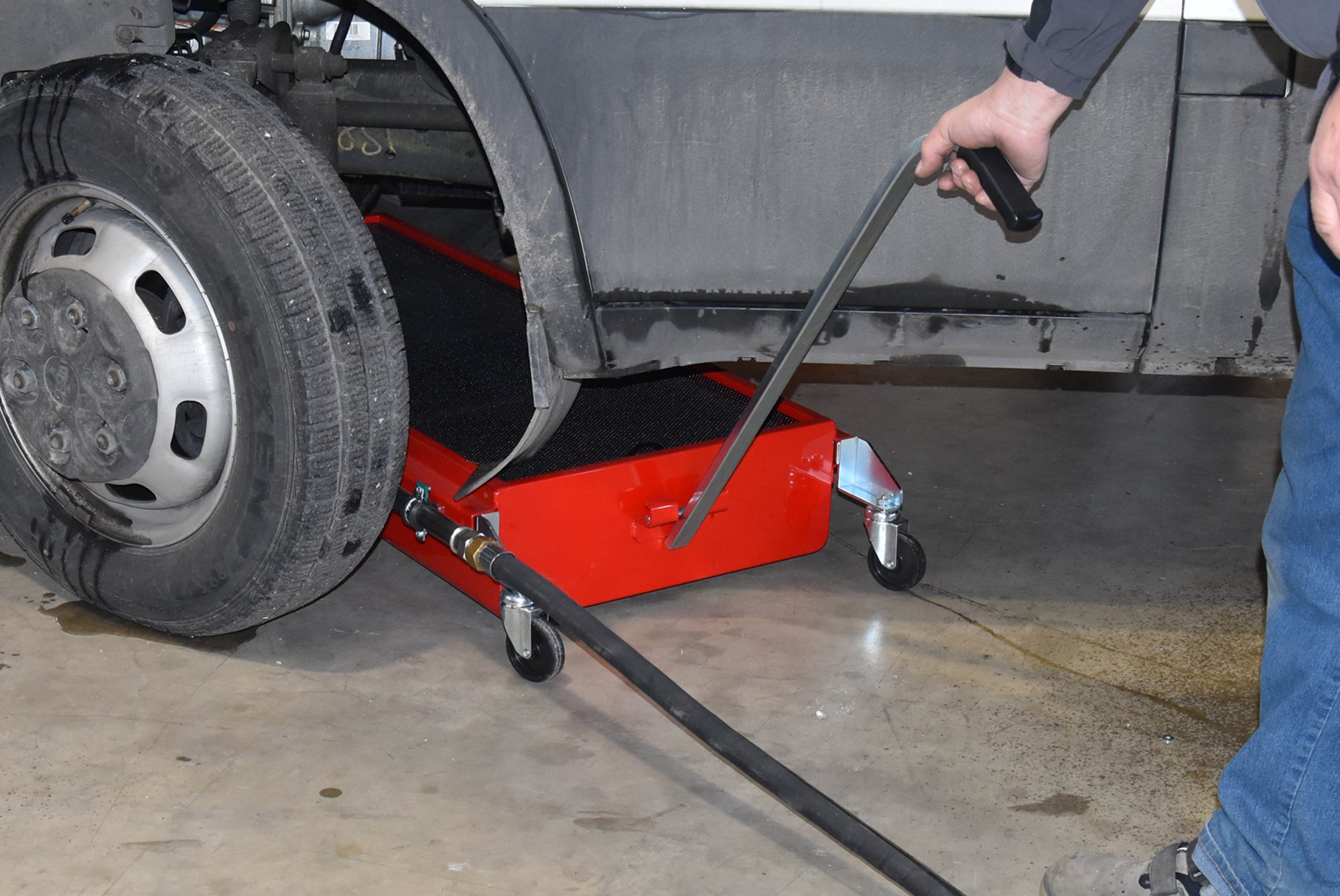 After precise positioning under the tank, fuel extraction is carried out automatically following the drilling process. Mobile collection trays with a capacity of 116 qt, which are easy to clean, reliably collect transmission and engine oil as well as coolant. Thanks to the combination of the drilling device and collection trays, lifting the vehicle is no longer necessary.